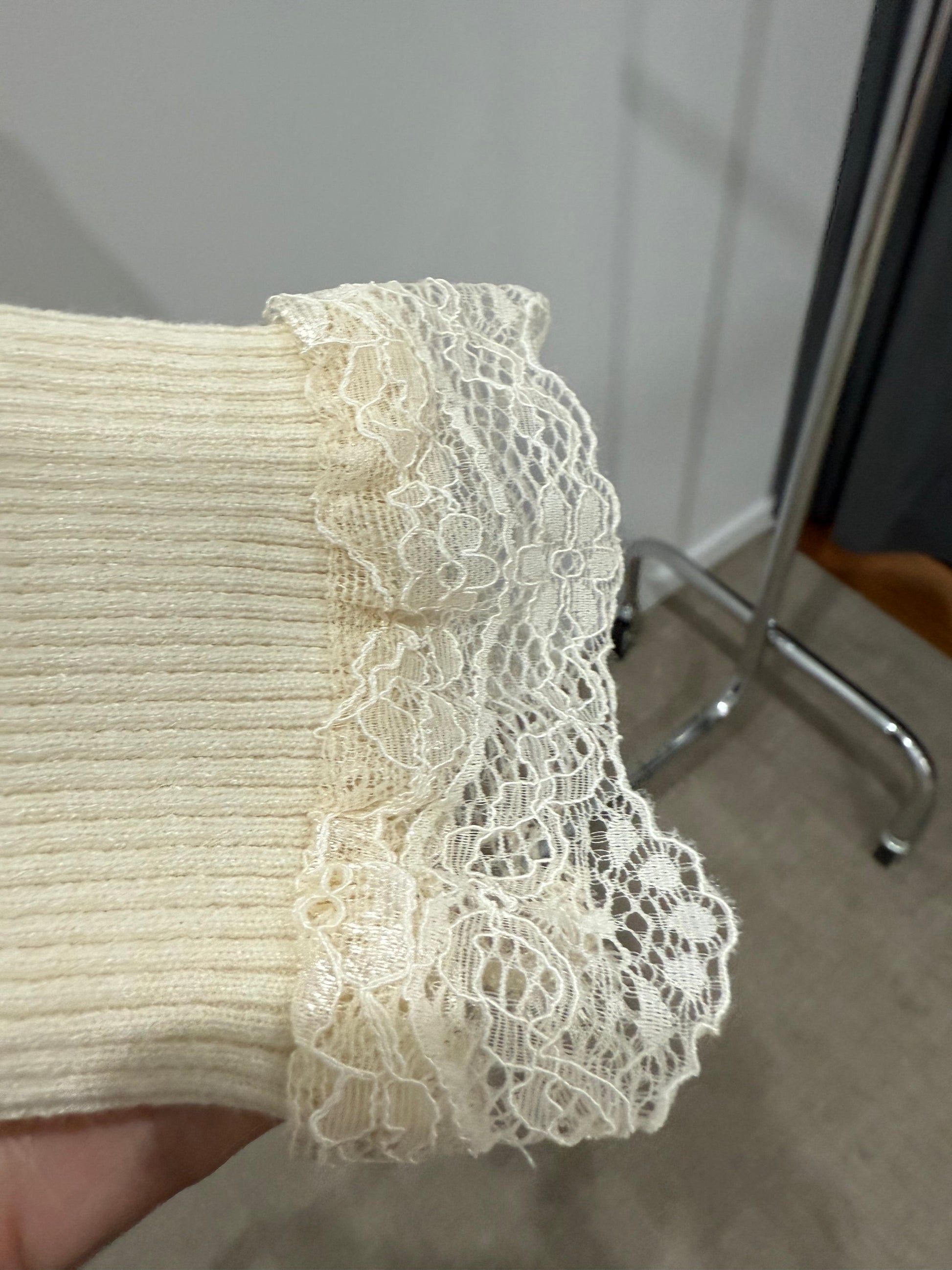 Camisola em malha justa com renda no decote e no punho