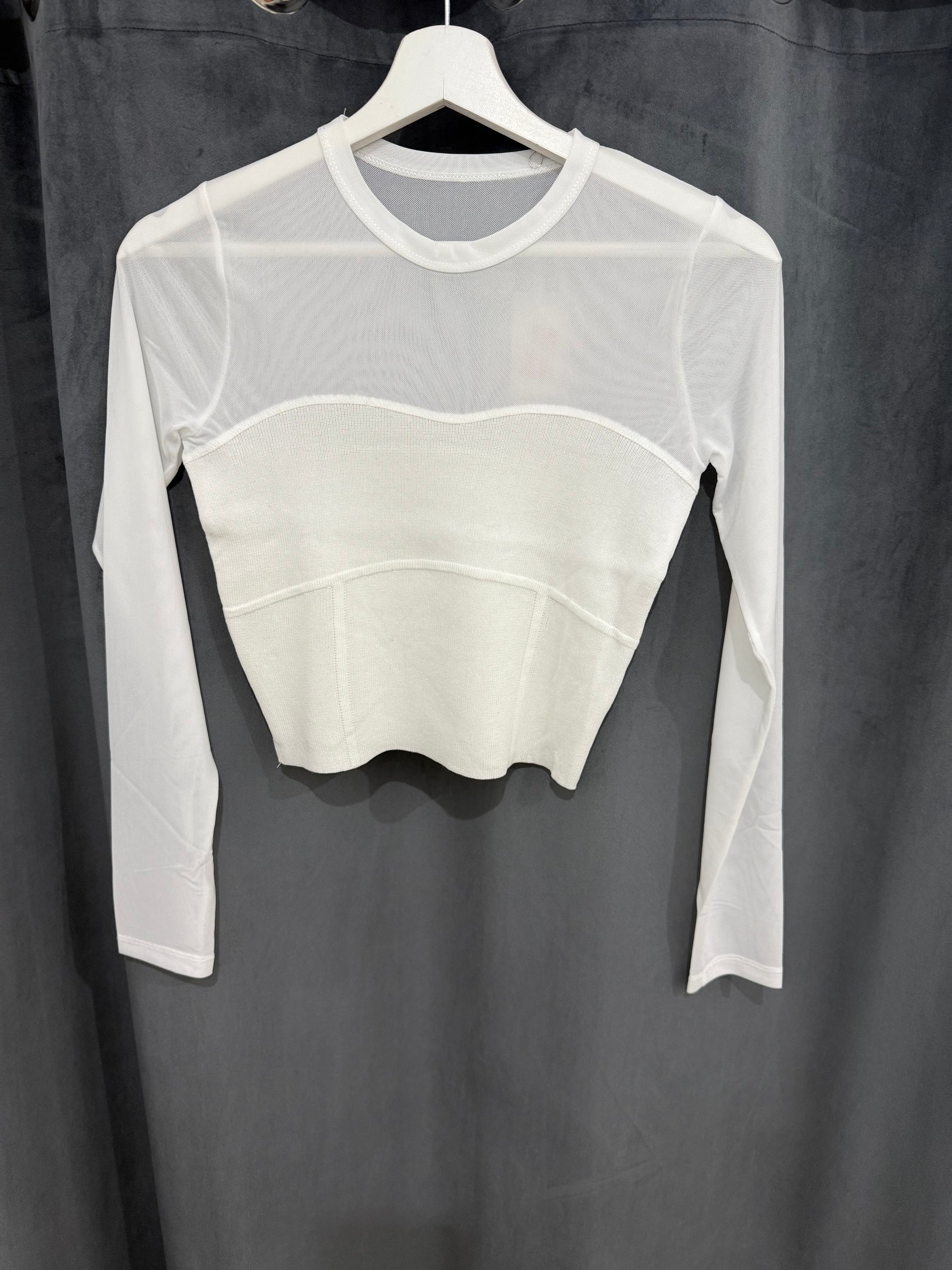 Camisola em malha com a parte superior em tecido transparente. É muita macia