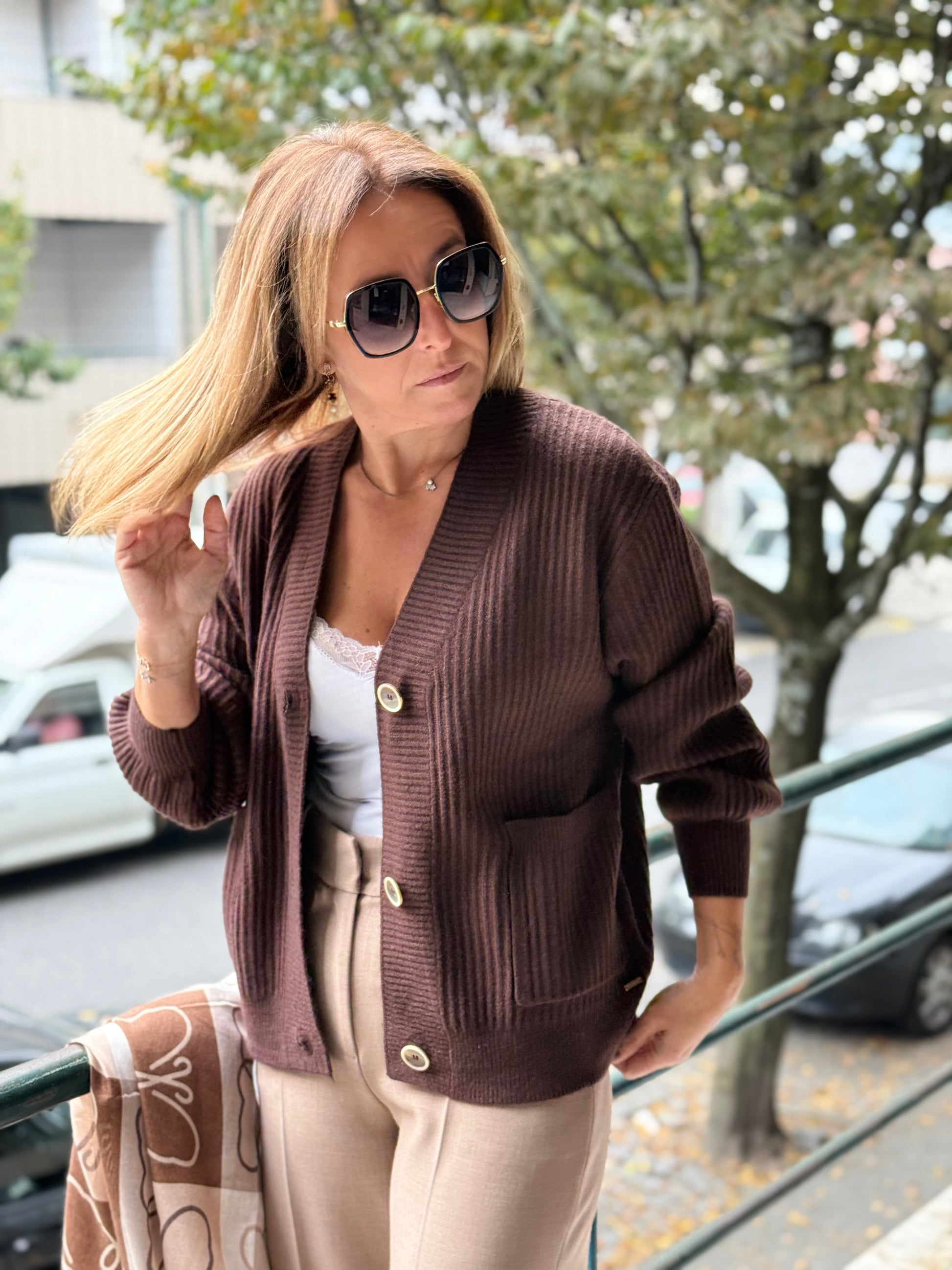 Casaco em malha canelada com bolsos